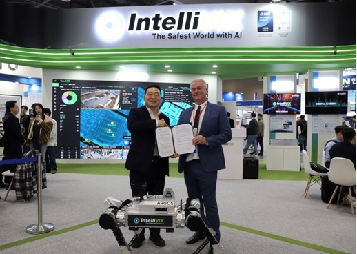 최은수 인텔리빅스 대표이사(사진 왼쪽)와 웨인 쇼우(Wayne Shaw) 톰쇼우 CEO가 SECON2026 인텔리빅스 부스에서 MOU 체결 후 기념사진을 촬영하고 있다. (사진제공 = 인텔리빅스] 안전 AI 딥테크 선도기업 인텔리빅스는 지난 18일 일산 킨텍스에서 열린 ‘세계보안엑스포(SECON) 2026’ 현장에서 호주의 글로벌 보안 전문기업 톰쇼우(Tom Shaw)와 자율주행 4족보행 순찰로봇 ‘아르고스(ARGOS)’의 호주향 맞춤형 로봇 개발을 위한 업무협약(MOU)을 체결했다고 19일 밝혔다.