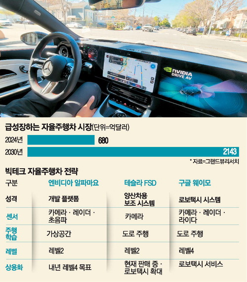 차량 주행 방식은 테슬라의 FSD나 실리콘밸리 일대에서 운행 중인 구글 웨이모 로보택시와 크게 다르지 않아 보였다. 그러나 차이는 학습 방식에 있다. 테슬라와 웨이모가 오랜 기간 실제 도로 주행 데이터를 축적해 성능을 끌어올린 반면,엔비디아는 현실 데이터를 기반으로 가상공간에서 대규모 시뮬레이션을 반복하는 방식에 무게를 두고 있다. 엔비디아에 따르면 이 차량 개발에는 약 100만시간 규모에 달하는 인간 주행 데이터와 시뮬레이션 데이터가 활용됐다. 하지만 수만 개 그래픽처리장치(GPU)를 동원하면 수백만 시간 분량 시뮬레이션도 단 하루 만에 돌릴 수 있다.