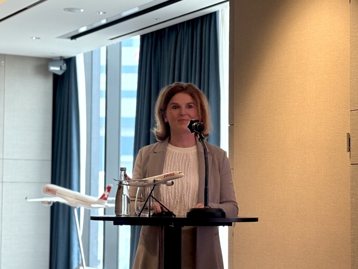 발표하는 하이케 빌렌바흐(Heike Birlenbach) 스위스 항공 최고상업책임자(CCO)/사진=김지은 여행+ 기자 스위스 항공은 지난 30일 서울 용산구에서 미디어 라운드테이블을 열고 스위스 취리히~인천 노선에 A350 항공기를 투입했다고 밝혔다.