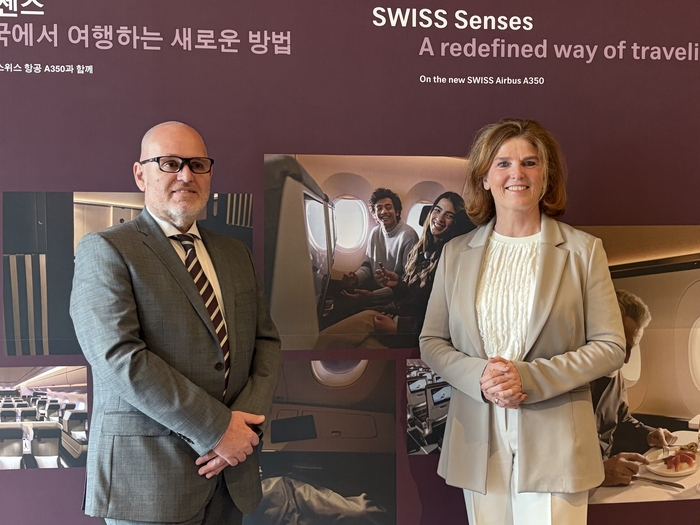 레안드로 토니단델 스위스 항공 한국 지사장(좌)과 하이케 빌렌바흐 CCO(우)/사진=김지은 여행+ 기자 최근 중동 정세 등으로 항공권 가격 변동성이 커지는 상황에서도 스위스 항공은 프리미엄 수요에 대한 자신감을 드러냈다. 스위스 항공에 따르면 A350 첫 인천편과 복귀편 모두 전 좌석이 매진됐다.