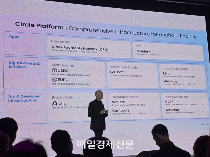온체인 외환 거래,유동성 서비스,개발자 도구 및 상호운용성 기능을 망라한 서클의 플랫폼 인프라 구조도 < 출처 : 매경DB > 알레어 CEO는 가장 먼저 원화스테이블코인에 대한 서클의 입장을 명확히 했습니다. 그는 “원화 스테이블코인 관련 법안은 주요 한국의 은행을 중심으로 추진될 가능성이 높다”며 “이러한 구조에서는 서클이 직접 발행 주체가 되기는 어려울 것”이라고 밝혔습니다. 대신 서클은 국내 금융사에 원화 스테이블코인 발행 인프라를 제공하는 역할을 맡겠다는 방침을 제시했습니다.