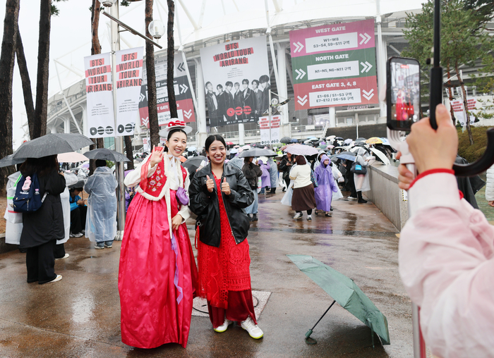 지난 9일 오후 경기도 일산 고양종합운동장 주경기장에서 BTS 월드투어 첫 공연을 보러 온 외국인 아미가 한복 크리에이터와 함께 아리랑 춤을 배우고 있다. [연합뉴스] 지난달 방탄소년단(BTS)의 광화문 공연을 계기로 외국인들이 대거 한국을 방문하면서 1분기(1~3월) 방한 외국인 관광객 수가 같은 분기 기준 역대 최대를 기록했다.