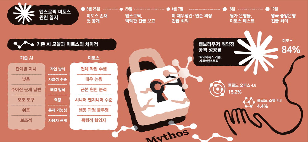 개발사 앤스로픽조차 "두렵다"…美·英 이어 한국도 긴급회의사이버 보안 뚫을 확률 84%단숨에 취약점 수천개 발견보안 뚫고 관리자 권한 탈취해커가 악용땐 웹 보안 붕괴은행·보험사·거래소 등 비상