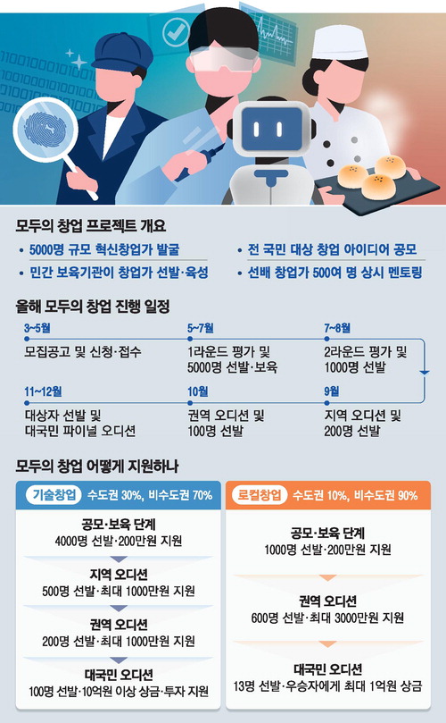 정부 '모두의 창업' 프로젝트 … 26일부터 신청민관 힘합쳐 초대형 창업 붐업'지역→권역→대국민' 오디션아이디어만 있으면 참여 가능토스 이승건·뤼튼 이세영 등스타 창업가 500여명 멘토로