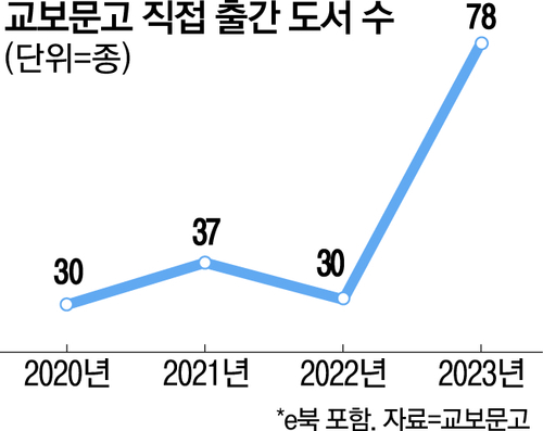 24일 교보문고에 따르면,교보문고가 직접 출간한 도서는 지난 2022년 30종에서 지난해 78종으로 급증한 것으로 나타났다. 이는 교보문고와 교보문고의 출판 브랜드 북다,마카롱에서 출간한 종이책과 e북(전자책)을 모두 합한 것이다. 올해 교보문고는 상반기에만 55종(e북 24종 포)에 달하는 도서를 선보여 지난해보다 더 많은 교보문고 도서가 독자를 만날 것으로 보인다. 교보문고 관계자는 “최근 콘텐츠 사업 강화 차원에서 다방면으로 드라이브를 걸고 있다”며 “도서 출간이 확대된 것도 그 일환”이라고 밝혔다.