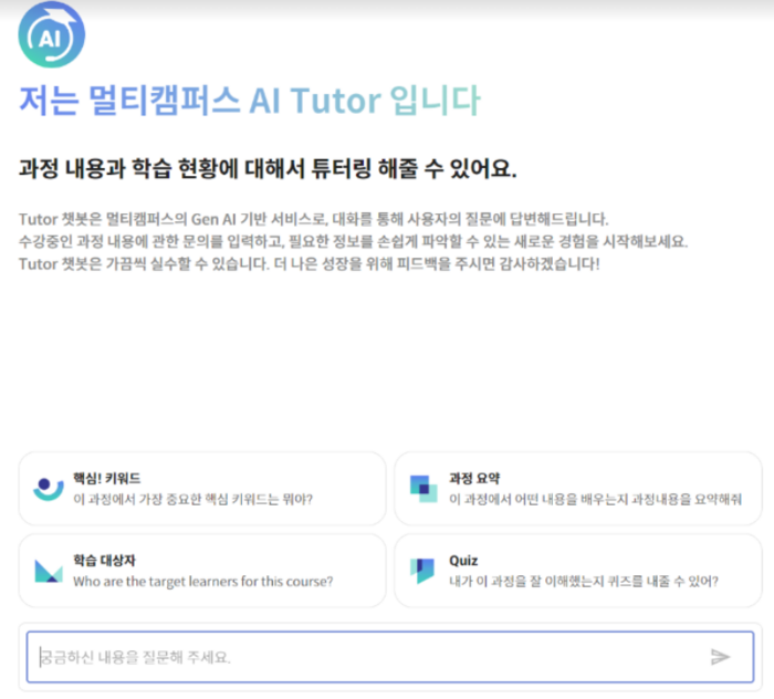 ‘AI Tutor’는 강의 자료 기반으로 구성된 생성형 AI 서비스로,학습 몰입도를 높이는데 도움을 준다. 강사를 대신해 강의 도중에도 학습자의 질문에 실시간으로 답변해준다. ▲학습 과정에 대한 요약 제시 ▲학습 내용 기반 퀴즈 제작 ▲오답 노트 제공 등 보조 강사 역할을 효과적으로 수행한다.