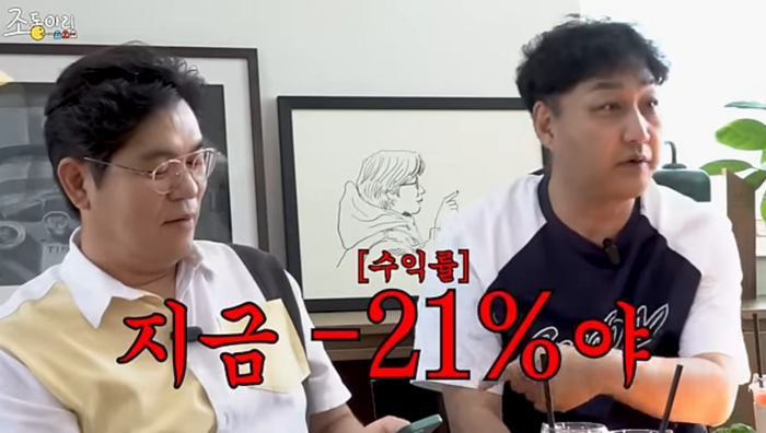 개그맨 김용만과 김수용. [사진 출처 = 유튜브 채널 ‘조동아리’ 영상 갈무리] “지금 (김용만의 비트코인 계좌 수익률은) -21%,원래 -60%였는데 많이 올랐다.” 최근 유튜브 채널 조동아리에서 개그맨 김용만의 계좌를 확인한 김수용이 이 같이 말했다.