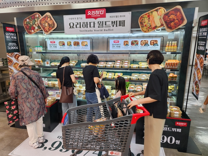 18일 유통업계에 따르면 롯데마트는 지난 6월 서울 제타플렉스 잠실점·서울역점,그랑그로서리은평점 등 4개 점포에서 즉석식품을 사서 바로 먹을 수 있는 ‘요리하다 월드뷔페’ 운영을 시작했다. 판매 시작 후부터 이달 15일까지 약 두 달(57일) 동안 6억원 어치의 매출을 올렸다. 같은 기간 누적 판매량은 13만5000개를 넘어섰다. 회사는 지난달 17일부터 경기 의왕점,군산점 등 적용 점포를 늘렸다. 현재 27개 점포에 요리하다 월드뷔페를 도입했고,전 점포로 확대하기로 했다.