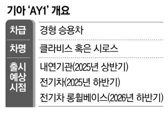 기아가 AY1 차량의 개발을 시작한 것은 지난해 초다. 업계에 따르면 2025년 1월 개발 완료를 목표로 먼저 내연기관 버전의 차량 개발이 시작됐다. 기아 협력사들에 따르면 최근 2025년 하반기를 목표로 AY1 전기차 개발 계획이 추가됐고,2026년 하반기를 목표로 'AY1 EV LWB' 개발도 진행 중인 것으로 파악됐다. EV LWB는 전기차의 롱휠베이스 버전을 의미한다.