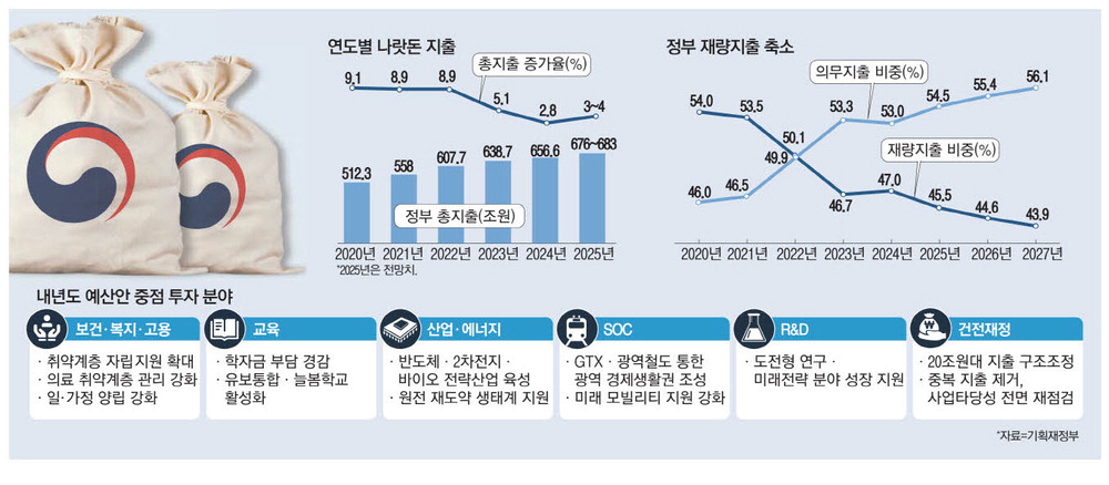 내년 총지출 증가율은 최근 정부가 전망한 내년도 경상성장률(4.5%)에 비해 낮다. 세입의 근거가 되는 생산과 물가(디플레이터) 상승분을 감안했을 때 경제가 성장하는 속도보다도 나랏돈 지출을 적게 늘리겠다는 뜻이다.