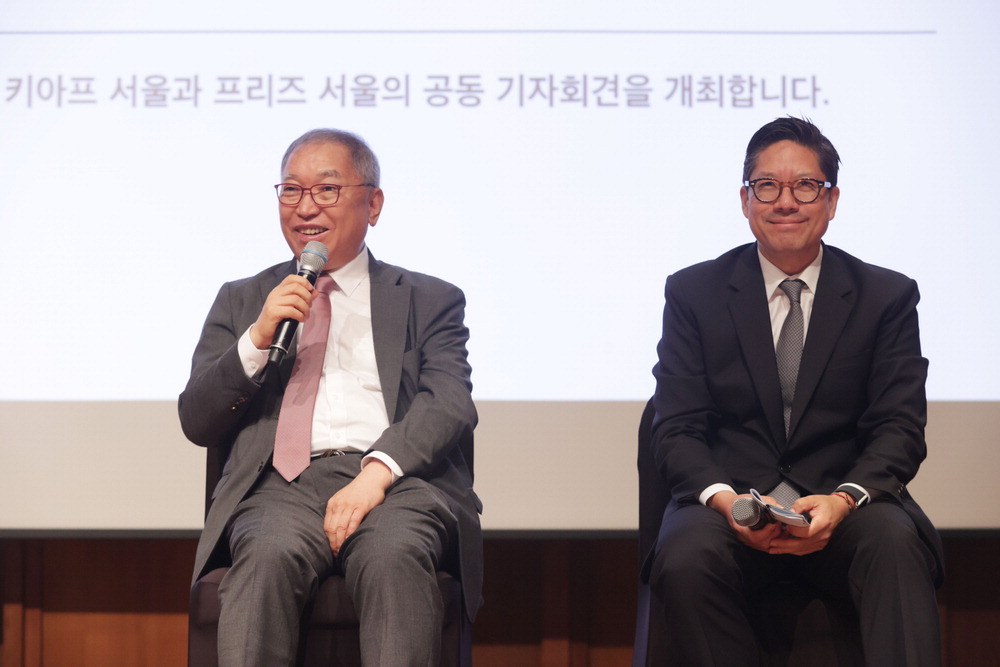 기자간담회에 참석한 황달성 화랑협회장(왼쪽),패트릭 리 프리즈서울 디렉터. 연합뉴스