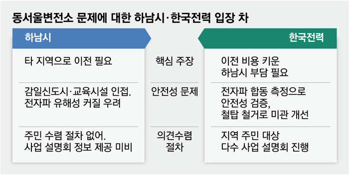 동해안에서 대량으로 생산된 전력을 수도권에 공급하기 위해선 하남시 감일동의 동서울변전소 설비용량을 늘려야 한다. 이곳에선 전압을 각 사업장이나 가정에서 쓸 수 있게 변환한다. 한전은 용량을 2GW에서 7GW로 늘리는 증설 작업을 추진하고 있었는데 하남시가 지난 21일 전자파 유해성 등 이유를 들어 불허 결정을 내렸다. 사업 부지가 감일신도시와 교육 시설에 인접해 있고 주민 의견 수렴 절차가 없었다는 이유에서다.
