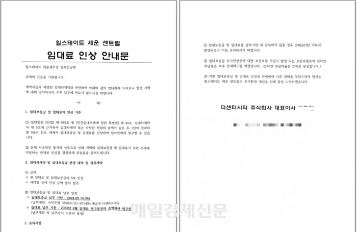 매경닷컴이 입수한 임대료 인상 안내문. [사진 = 매경DB] 시행사의 이 같은 요구 뒤에는 민간임대주택 특별법의 허점이 있다.