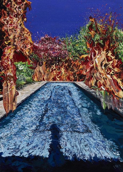 구름 한 점 없는 맑고 푸른 하늘,나무가 울창한 정원 속 고급 풀빌라. 그런데 이 환상적인 휴가를 단박에 깨뜨리는 매서운 화염이 수영장을 둘러싸고 있다. 하지만 정작 이곳에 있는 사람은 불길에도 아랑곳하지 않는 듯하다. 입수 전 스마트폰으로 이 초현실적인 장면을 찍고 있는 걸까. 햇빛이 일렁이는 잔잔한 물 아래 비치는 수영장 바닥에 한 사람의 그림자가 보인다.