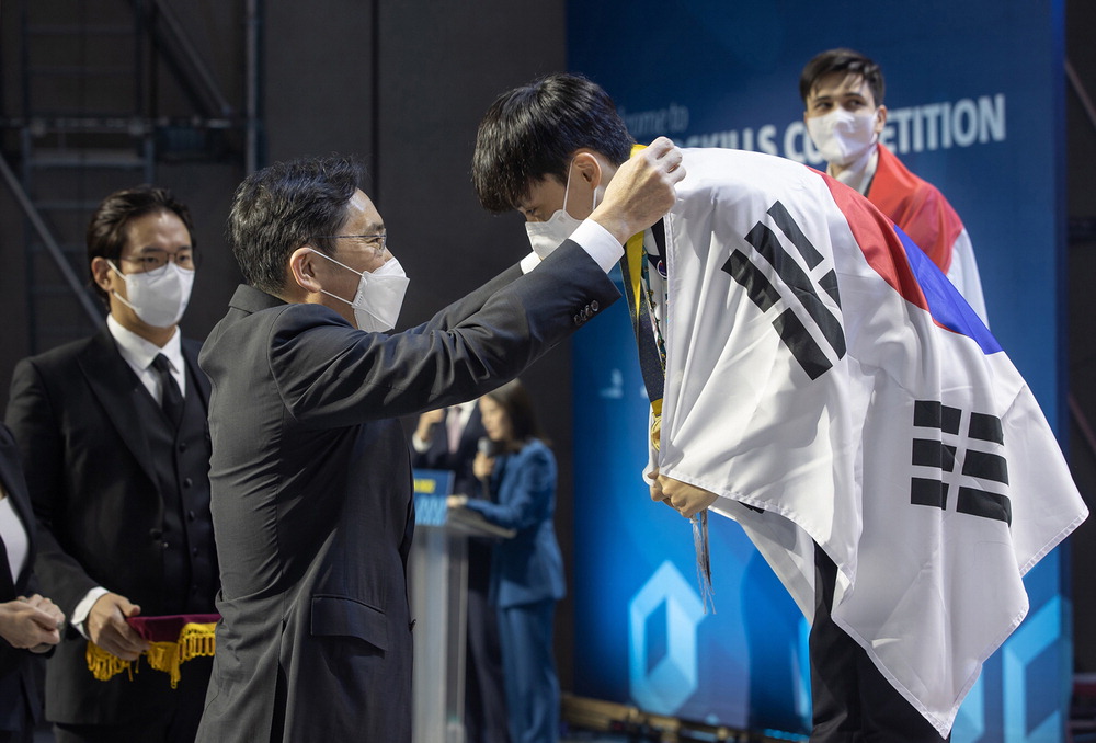 이재용 삼성전자 회장이 2022년 10월 열린 2022 국제기능올림픽 폐회식에서 수상자들에게 메달을 수여하고 있다. 삼성전자