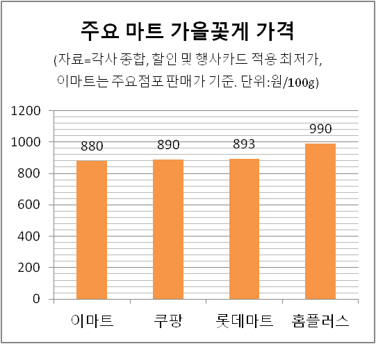 지난주 후반부터 대형마트 3사가 가을 꽃게 판매 경쟁에 돌입한 가운데 이마트가 전단지에 표시한 100g당 950원보다도 70원 내린 880원에 판매하고 나서 눈길을 끈다. 경쟁사인 롯데마트와 쿠팡이 890원대로 이마트보다 가격을 더 낮게 책정하자 ‘최저가=이마트’라는 공식을 지키기 위해 추가 할인에 나선 것이다.