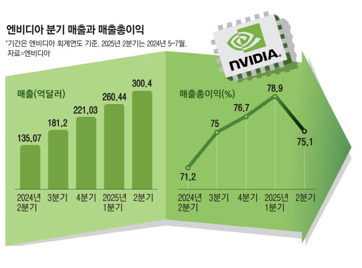 전 세계가 주목했던 엔비디아의 분기 실적 발표는 하락장으로 마감했다. 시장 예상치를 상회하는 숫자가 공개됐지만,엔비디아 주가는 시간 외 거래에서 7% 급락했다. 올해 새롭게 출시하는 인공지능(AI) 반도체 블랙웰 그래픽처리장치(GPU)에 대한 불안이 역대급 실적을 잠재운 탓이다. 다른 기술주 투자심리에도 부정적 영향을 줄 전망이다.