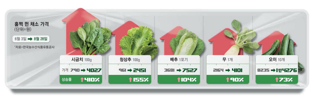 29일 한국농수산식품유통공사에 따르면 상추와 시금치 등 폭염에 약한 채소 가격이 최근 폭등한 것으로 나타났다. 상추 가격은 청상추 기준 6월 초까지만 해도 100g당 961원으로 1000원이 안 됐지만 이달 28일 2451원으로 급등했다. 올여름 폭염을 겪으면서 가격이 2.5배 뛴 것이다. 시금치 가격은 더 심각하다. 28일 기준 100g당 4027원으로 4000원을 돌파했다. 6월 가격은 790원이었는데 무려 5배가량 폭등했다. 같은 기간 배추 1포기 가격도 2배 넘게 올랐으며 무(1개)와 오이(10개) 가격도 각각 90%,73% 인상됐다. 이들 가격은 지난해 같은 기간과 비교해도 30~70% 오른 상황이다.