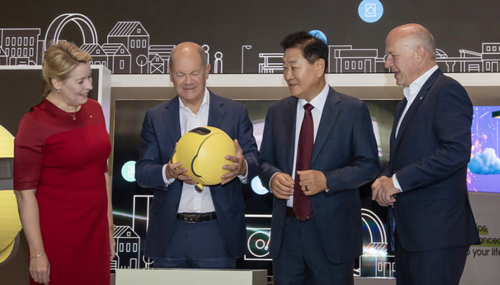 6일(현지시간) ‘IFA 2024’ 삼성전자 전시관을 방문한 올라프 숄츠 독일 총리(왼쪽 둘째)가 인공지능(AI) 로봇 ‘볼리’를 살펴보고 있다. [사진 제공 = 삼성전자] 5일(현지시간) 독일 베를린에 있는 ‘메세 베를린’ 건물에선 6일부터 열릴 유럽 최대 가전 전시회 ‘IFA 2024’를 위한 준비가 한창이었다. 그중 삼성전자와 LG전자는 발빠르게 관람객을 맞을 준비를 마친 모습이었다.