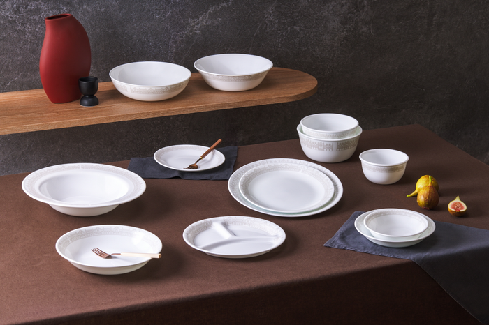정갈하고 고급스러운 테이블 연출에 제격인 뉴트럴 컬러의 세계 유일 3중 압착 비트렐 유리(Vitrellertm Glass) 소재에,코렐의 탁월한 패턴 장인정신으로 중세 건축물의 디자인을 현대적 감각으로 재해석하여 심플하고 세련된 디자인과 클래식한 아름다움을 동시에 살렸다.