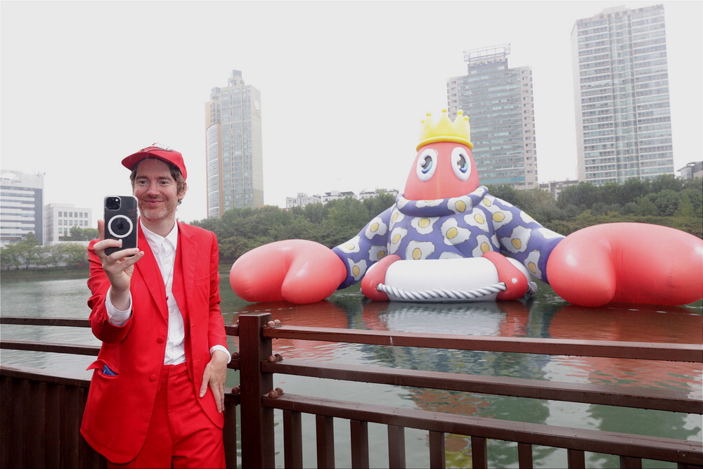 지난 6일 오전 서울 송파구 잠실 석촌호수에서 필립 콜버트 작가가 랍스터 서울 에디션 작품과 기념촬영을 하고 있다. 연합뉴스
