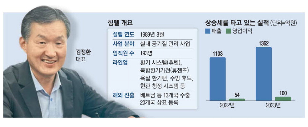 1989년 설립된 힘펠은 국내 환풍기 시장 1위 업체다. 실내의 오염된 공기를 밖으로 배출하고 실외 공기는 필터를 통해 여과해 깨끗해진 공기만을 들여보내는 환기 시스템 분야에서 국내 최고 기술력을 갖췄다는 평가를 받는다. 환기 시스템은 미세먼지를 비롯해 이산화탄소와 휘발성 유기화합물(VOCs)까지 제거한다는 점에서 공기청정기와 차별화된다.