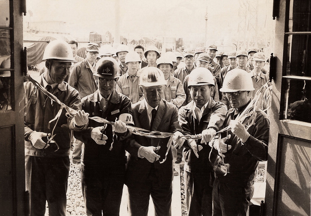 1969년 전북 전주시 삼양사 폴리에스터 공장 준공식에서 창업자 수당 김연수 선생(앞줄 가운데)을 비롯한 삼양사 경영진이 테이프를 자르고 있다. 삼양그룹
