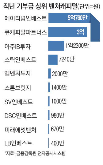 이외에 엠벤처투자(2000만원),스톤브릿지벤처스(1400만원) 등은 연간 기부금 액수가 1000만원 안팎이었다.