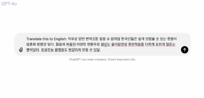 오픈AI가 공개한 영상을 보면 오원은 한국인도 제대로 이해하지 못할 정도로 꼬아서 만든 문장을 영어로 완벽하게 번역했다.