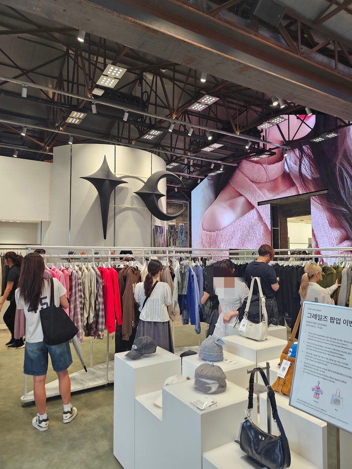 13일 무신사 스토어 성수@대림창고에서 쇼핑하는 고객들 모습. [김효혜 기자] 매장에 들어서면 높은 천장과 탁 트인 공간이 한 눈에 들어온다. 정면에 놓인 커다란 스크린에선 브랜드 영상이,오른쪽엔 포토존이,왼쪽엔 ‘그레일즈’와 ‘떠그클럽’ 팝업 전시가 진행되고 있다.