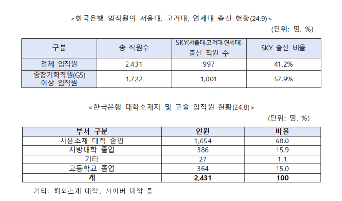 13일 국회 기획재정위원회 소속 진성준 더불어민주당 의원이 한은에서 받은 자료에 따르면 올해 9월 기준 한국은행 G5 이상 임직원 1722명 중 SKY 출신은 997명(57.9%)으로 집계됐다. 일반사무직원,기능직원 등을 포함한 전체 임직원 총 2431명 중에선 41.2%에 달했다. 이중 서울 소재 대학 졸업자는 1654명으로 전체 임직원 중 68%에 달했다. 반면,지방대학 졸업자는 386명(15.9%),고졸 364명(15.0%),기타 사이버 대학 등은 27명(1.1%)에 불과했다.