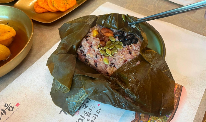 포룡정 / 사진=류한나래 여행+ PD 궁남지 구경을 마쳤다면 연잎밥을 먹으러 가보자. 부여에서 손꼽히는 연잎밥 맛집인 ‘솔내음’ 음식점에 찾았다. 솔내음에서는 연잎밥,떡갈비,계절 반찬 10가지,된장찌개를 한 번에 맛볼 수 있는 연잎 떡갈비 정식을 판매 중이다. 내부에 들어가니 은은한 소나무 향기가 느껴졌다. 자세히 살펴보니 소나무를 사용해 건물을 지어 소나무의 자연스러운 향기가 실내에 스며들어 있었다.