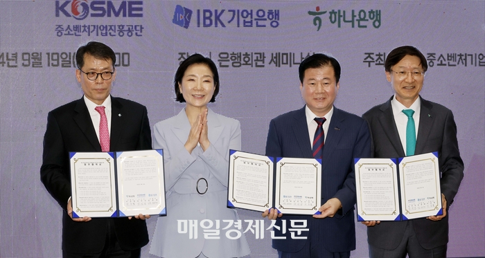 오영주 중소벤처기업부 장관이 19일 서울 중구 은행회관에서 중소벤처기업진흥공단-IBK기업은행-하나은행 간 중소기업 재직자 우대 저축공제 도입을 위한 업무협약식에 참석해 기념 촬영하고 있다. 왼쪽부터 김성태 기업은행장,오영주 중소벤처기업부 장관,강석진 중소벤처기업진흥공단 이사장,이승열 하나은행장. 2024.9.19 [김호영기자]