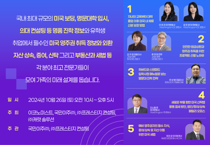 국내 최대 미국 영주권 그룹 국민이주㈜는 미국 교육 컨설팅 기업인 ㈜프레스티지 컨설팅과 공동으로 오는 26일 오전 10시부터 오후 5시까지 서울 한남동 소재 ㈜캐럿글로벌에서 포럼을 개최한다. 이날 포럼에는 해당 분야 전문가들이 강사로 나와 미국 보딩(기숙학교),명문 대학 입시,의대 진학 관련 정보를 제공한다.
