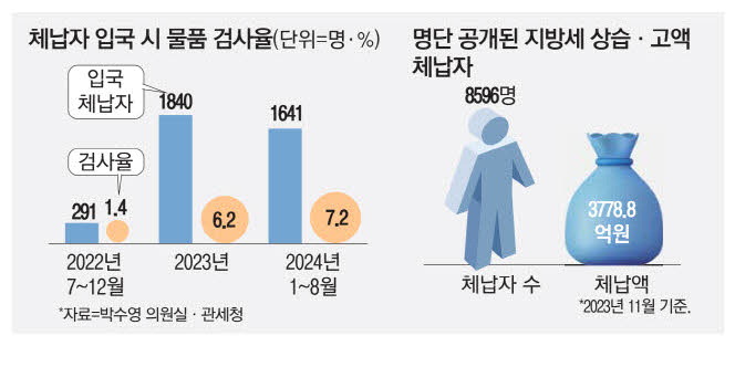 15일 국회 기획재정위원회 소속 박수영 국민의힘 의원이 관세청에서 받은 자료에 따르면 제도가 시행된 2022년 7월부터 올해 8월까지 해외에서 입국해 세관을 거친 체납자는 모두 3772명이었는데,이 중 휴대품 검사를 받은 경우는 236명으로 전체의 6.3%였다. 제도 시행 첫해인 2022년 하반기 검사율은 1.4%에 불과했고 2023년 6.2%,올해는 7.2%였다.