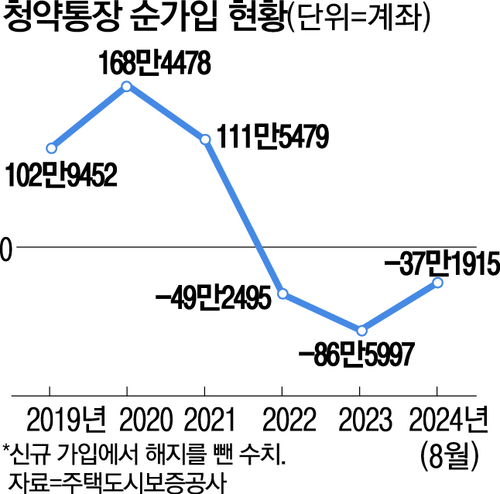 최근 5년간 청약통장의 신규 가입자보다 해지자가 많아진 것은 2022년부터였다. 순가입 계좌가 2020년(168만4478좌),2021년(115만5479좌)은 증가했지만 2022년 순가입자가 49만2495좌 감소,2023년 86만5997좌 감소했다.