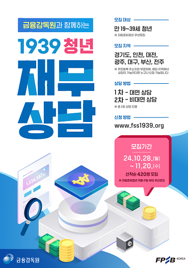 금융감독원,1939 청년 재무상담 포스터. <금융감독원> 금융감독원이 만 19~39세 청년 400여명에게 일대일 무료 맞춤형 재무상담 서비스를 지원한다. 청년들의 경제적 자립과 자산형성을 돕기 위해서다.