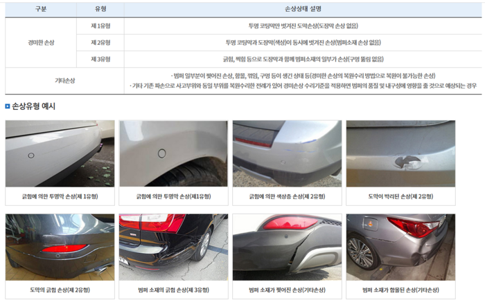 자동차 범퍼 손상 유형별 분류 기준.[자료 제공 = 보험개발원] 자동차보험 표준약관에는 복원수리비만 지급하는 경미한 손상의 범위를 보험개발원이 정한 기준에 따르도록 한다고 명시돼 있습니다. 경미한 손상은 자동차의 기능과 안전성을 고려했을 때 부품 교체 없이 외관상 복원이 가능한 경우로 정의합니다.예컨대 투명 코팅막만 벗겨진 도막손상(도장막 손상 없음),투명 코팅막과 도장막(색상)이 동시에 벗겨진 손상(범퍼소재 손상 없음),긁힘,찍힘 등으로 도장막과 함께 범퍼 소재의 일부가 손상(구멍 뚫림 없음)된 사례가 그것입니다.해당 유형 안에서 이뤄진 손상은 부품 교체비 대신 복원수리비만 지급하는 게 원칙입니다.불필요한 비용 발생으로 인한 선량한 자동차보험 가입자들의 보험료 인상을 막기 위한 최소한의 원칙인 셈이죠. 즉,범퍼가 찢어지거나 구멍이 나거나 휘어져 복구가 불가한 경우에 한해서만 교체를 해야 한다는 것입니다.
