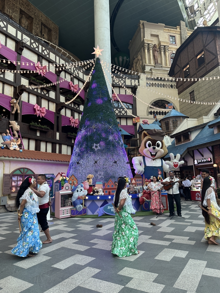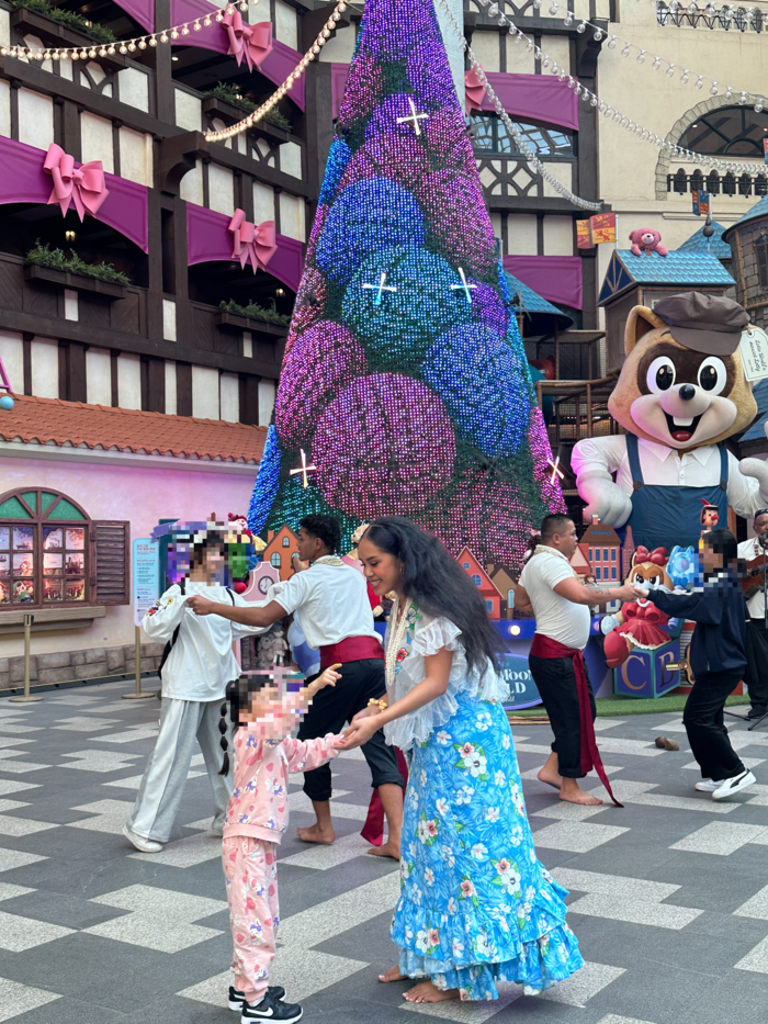 공연단과 춤을 추는 손님들. /사진= 강예신 기자 놀이기구를 기다리는 시간이 지루하지 않도록 신나는 차모로 전통 공연도 펼쳤다. 오후 3시와 5시에 두 번에 걸쳐 차모로 공연단의 전통 음악 및 춤 무대가 열렸다. 손님들은 공연단과 함께 전통 춤을 춰보고 기념사진을 찍는 등 괌 여행에 온 듯한 특별한 추억을 남길 수 있었다.