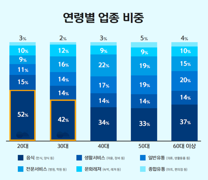 20대의 51.7%,30대의 41.5%가 요식업에 종사하는 것으로 나타나 다른 업종에 비해 높은 비중을 차지했다. 특히 새로운 음식에 대한 거부감이 적고,다양한 경험을 중시하는 MZ세대의 취향을 감안해 글로벌 미식 트렌드를 반영한 다양한 요리를 제공하는 음식점을 많이 운영하고 있다는 분석이 나온다.