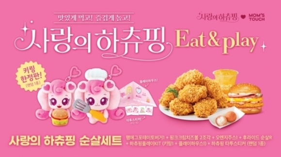 버거 프랜차이즈 맘스터치는 ‘하츄핑 버거 세트’를 만들어 티니핑 인형을 함께 판매한다. [사진 = 맘스터치 제공] 버거 프랜차이즈 맘스터치는 ‘하츄핑 버거 세트’를 만들어 티니핑 인형을 함께 판매한다. 해당 세트를 구매하면 ‘하츄핑 타투 스티커’,‘하츄핑 캐릭터 키링’,어린이용 놀이 기구인 ‘플레이하우스’ 등을 받을 수 있다. 맘스터치 관계자는 “구체적인 매출액을 공유하긴 어렵지만 어린이가 있는 4인 가족,또 키덜트족 고객들의 반응이 좋다”며 “프로모션 기간 중엔 다른 기간보다 매출량이 많이 늘기 때문에 가맹점들도 호응하고 있다”고 설명했다.