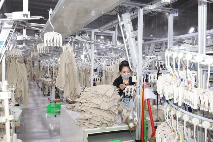 TG법인 직원의 약 28%(1040명)가 근무하는 8공장에선 행거라인을 자동화해 작업자가 무거운 원단을 직접 들 필요 없이 앉은 자리에서 생산과 품질에 집중할 수 있다. 현재 가동 중인 16개의 생산라인에서 연간 390만장의 의류를 생산해낸다.