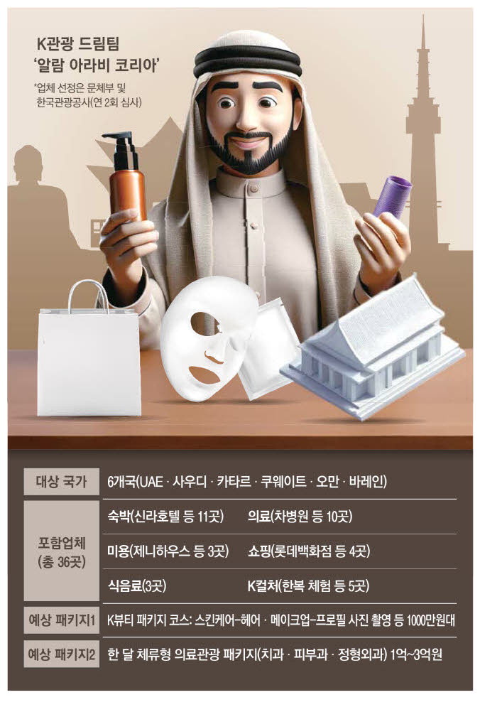 문체부와 관광공사는 올해 말까지 추가 검증을 거쳐 최종 라인업을 확정할 방침이다. 중동 민관협의체 '알람 아라비 코리아'(한국 속 아랍 세상)로 명명된 이번 1차 드림팀은 숙박 11곳,의료 10곳,미용 3곳,쇼핑 4곳,식음료 3곳,K컬처 5곳 등 총 36곳이다.