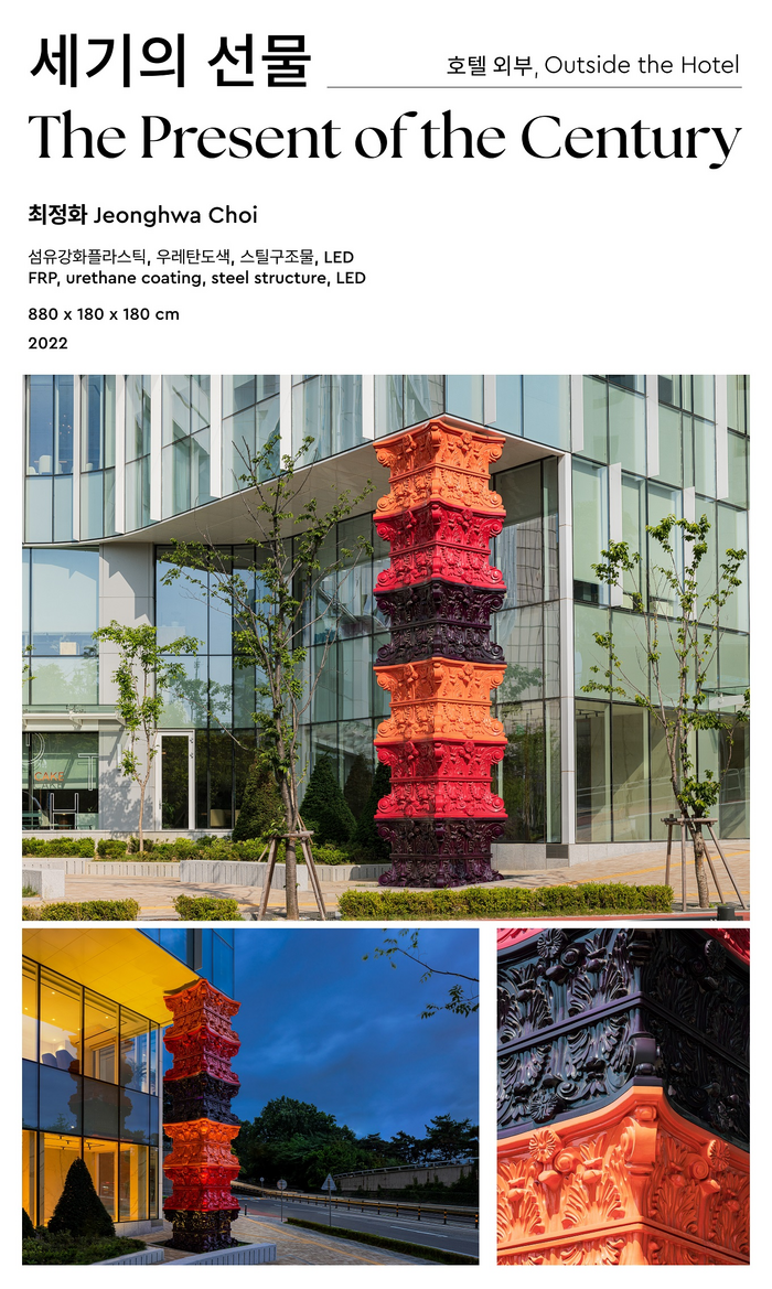 세기의 선물 / 사진=호텔나루서울 홈페이지 ‘럭셔리 예술 호텔’ 부문 수상에 걸맞게 호텔 나루 서울 엠갤러리 호텔 곳곳에서 예술 작품을 감상할 수 있다. 호텔 전면부에 있는 기둥은 최정화 작가 ‘세기의 선물’ 작품으로 건축물 자체와 조화를 이룬다. 안내 접수대가 있는 20층에는 8m에 달하는 양혜규 작가의 ‘창공해로’가 자리하고 있다.