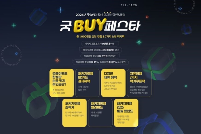 노랑풍선 ‘굿 바이 페스타’ 행사 / 사진=노랑풍선 노랑풍선은 이번 ‘굿 바이(BUY) 페스타’ 행사에서 해외 패키지여행을 BC카드로 결제한 고객에게 최대 7만 원의 2% 즉시 할인과 IBK 기업은행 개인 신용카드를 발급받은 후 결제할 시 최대 5만 원의 3% 추가 청구할인 혜택을 제공한다. 올해 12월 31일까지 BC카드로 노랑풍선 국내·외 전 패키지 상품을 400만 원 이상 결제하면 12개월 장기 무이자 특전도 받을 수 있다.