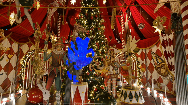 더현대서울 크리스마스 연출.[사진=김현정 기자] 서커스 극장은 마술 극장,묘기 극장,음악 극장,대극장과 상점들로 구성돼있다. 올해 장식에서 특별히 신경썼다는 대극장에는 높이 8m의 대형 회전형 크리스마스 트리가 등장,현대백화점 15개점을 상징하는 15개의 캐릭터가 동적인 퍼포먼스를 선보였다.