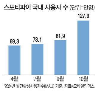 국내 음악 스트리밍 앱 사용자 순위는 10월 기준 유튜브 뮤직이 754만9327명으로 1등 자리를 차지하고 있으며 멜론(706만6811명) 지니뮤직(291만7375명) 플로(217만7833명) 스포티파이(127만9189명)가 뒤를 잇고 있다. 이용자가 40만명 이상 늘어난 스포티파이는 네이버 바이브(60만7368명) 벅스(36만3497명)와는 격차를 벌리면서 플로와 지니뮤직을 추격하게 됐다. 이용자 수가 정체된 토종 앱에는 스포티파이의 활약이 추가적인 위협으로 떠오를 전망이다.