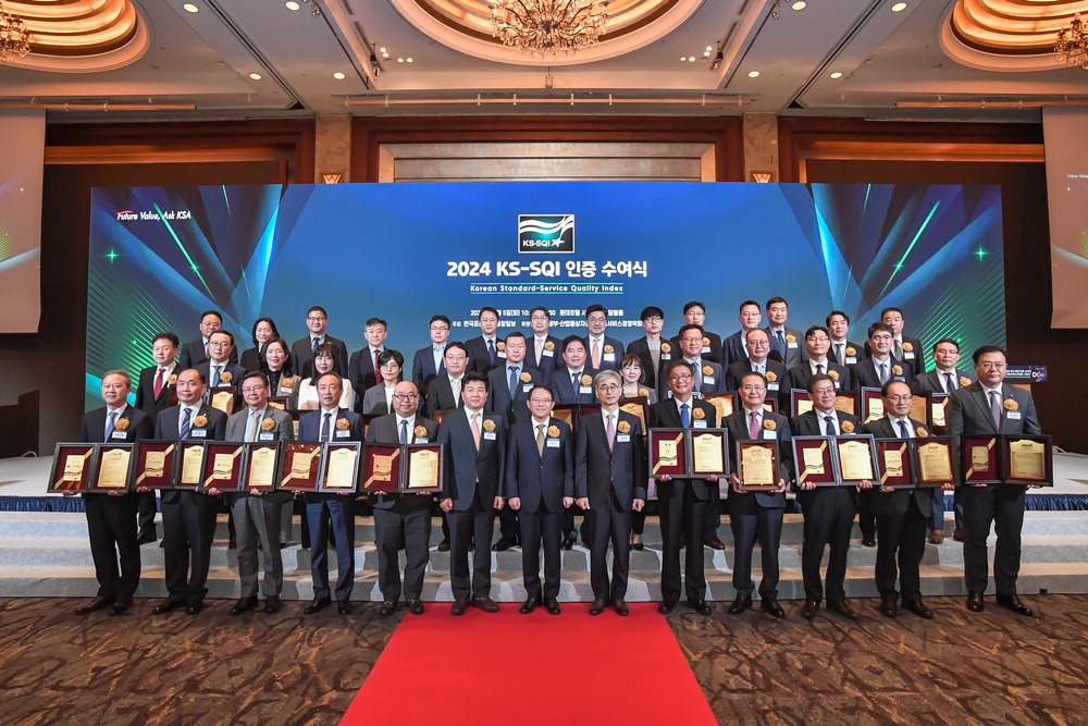 5일 서울 소공동 롯데호텔에서 개최된 '2024 KS-SQI 인증 수여식 및 DX서비스어워드 시상식'에서 수상자들이 기념촬영을 하고 있다. 앞줄 왼쪽부터 양오봉 전북대 총장,한정석 부천대 총장,윤승규 가톨릭대 서울성모병원장,오선 서일대 총장,김명석 삼성물산 건설부문 부사장,염태정 중앙일보 국장,강명수 한국표준협회장,이유재 서울대 석좌교수,배택영 삼성물산 에버랜드 부사장,이광석 중앙고속 대표,전성훈 서강대 교학부총장,오성근 한양사이버대 부총장,김상민 롯데호텔 본부장. 한국표준협회