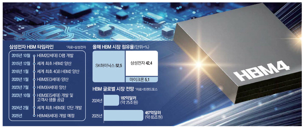 삼성전자는 HBM4 개발 로드맵을 올해 3분기 실적 발표에서 구체적으로 발표한 바 있다. 내년 하반기까지 개발을 끝내고 양산까지 돌입하겠다는 구상이다. 애초 목표인 2026년보다 6개월 가까이 앞당겼다.