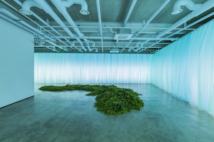 박소희의 보태니컬 설치 작품 ‘Le sol_soil’(2024) 뒤로 외부 창을 덮은 박기원의 ‘중정’(2024)이 자연광을 은은하게 전시장으로 끌어들이고 있다. 라인문화재단